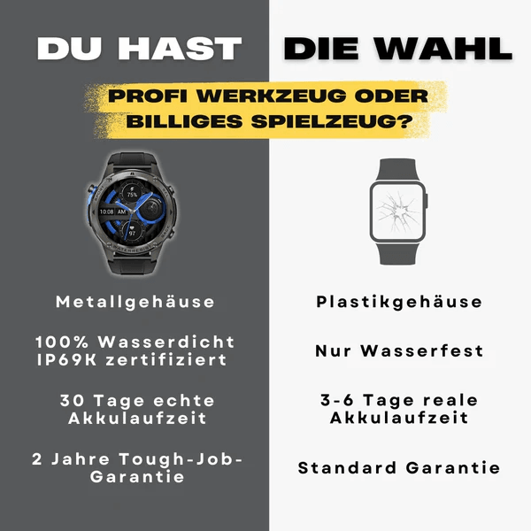 Billige Uhren versprechen viel, halten aber wenig. Die BULLET-X PRO setzt mit Metallgehäuse, echter Wasserdichtigkeit, dreifacher Akkulaufzeit und zuverlässiger Garantie neue Maßstäbe für Profis.