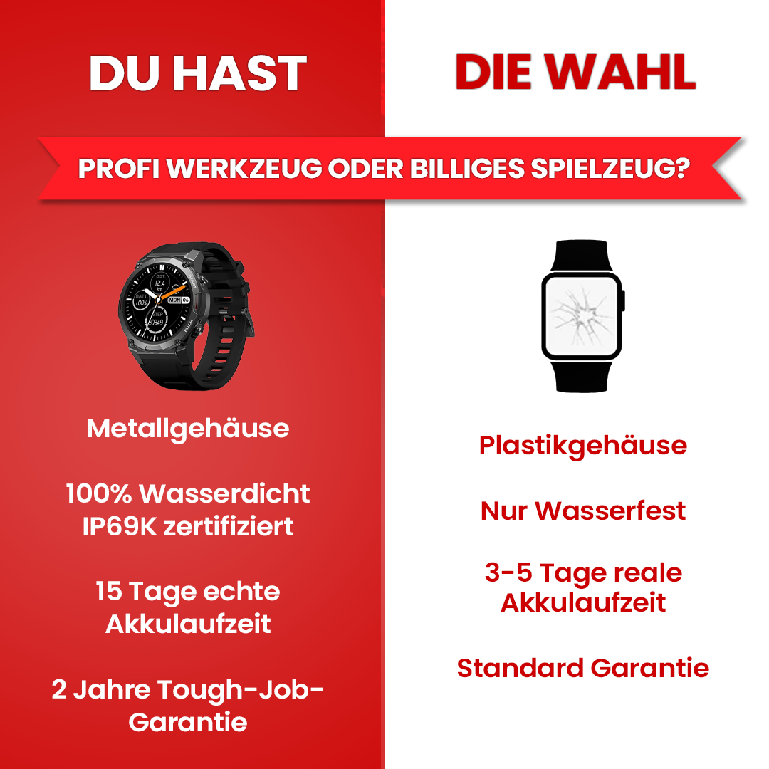 Billige Uhren versprechen viel, halten aber wenig. Die GOLIAT 7 PRO setzt mit Metallgehäuse, echter Wasserdichtigkeit, doppelter Akkulaufzeit und zuverlässiger Garantie neue Maßstäbe für Profis.
