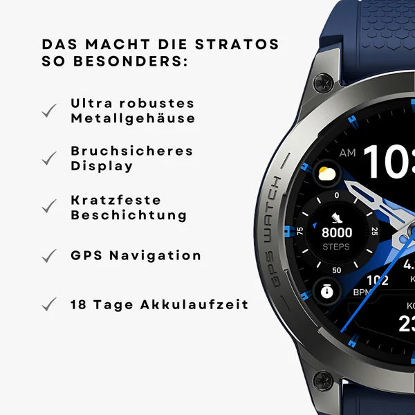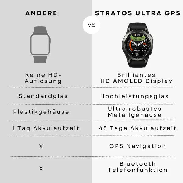 Die STRATOS ULTRA GPS ist eine hochwertige Smartwatch mit robustem Metallgehäuse, scharfem AMOLED-Display, präzisen Sensoren und klarer Bluetooth-Telefonie – perfekt für alle, die Technik, Stil und Langlebigkeit in einem Gerät suchen.