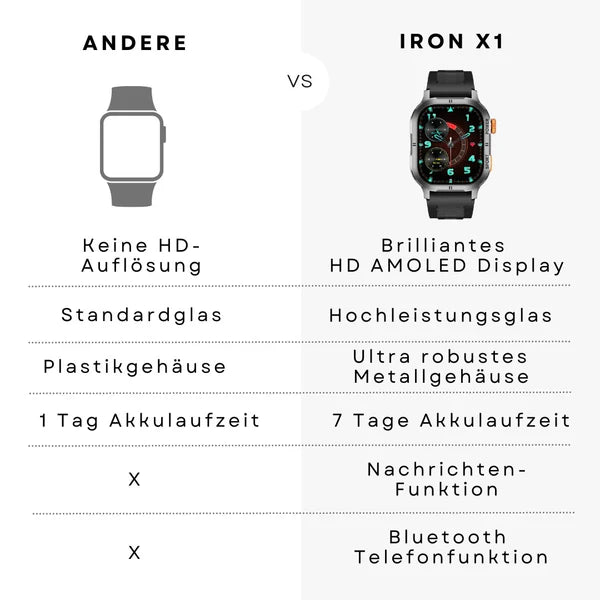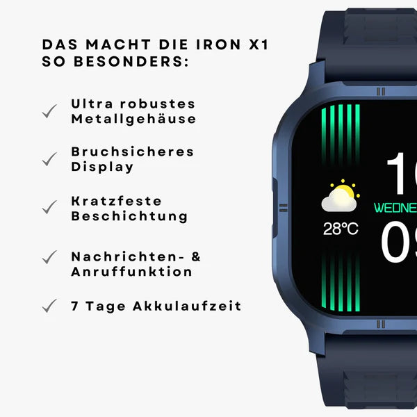 Die IRON X1 ist eine robuste Smartwatch mit widerstandsfähigem Metallgehäuse, bruchsicherem Display und zuverlässigem IP68-Schutz gegen Wasser und Staub. Mit einer Akkulaufzeit von bis zu 7 Tagen ist sie ein langlebiger Begleiter für den Alltag.
